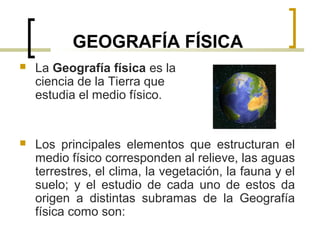 GEOGRAFÍA FÍSICA La Geografía física es la ciencia de la Tierra que estudia el medio físico. De ejemplos concretos de su entorno sobre la relación entre la geografía física y humana. Select a source type.