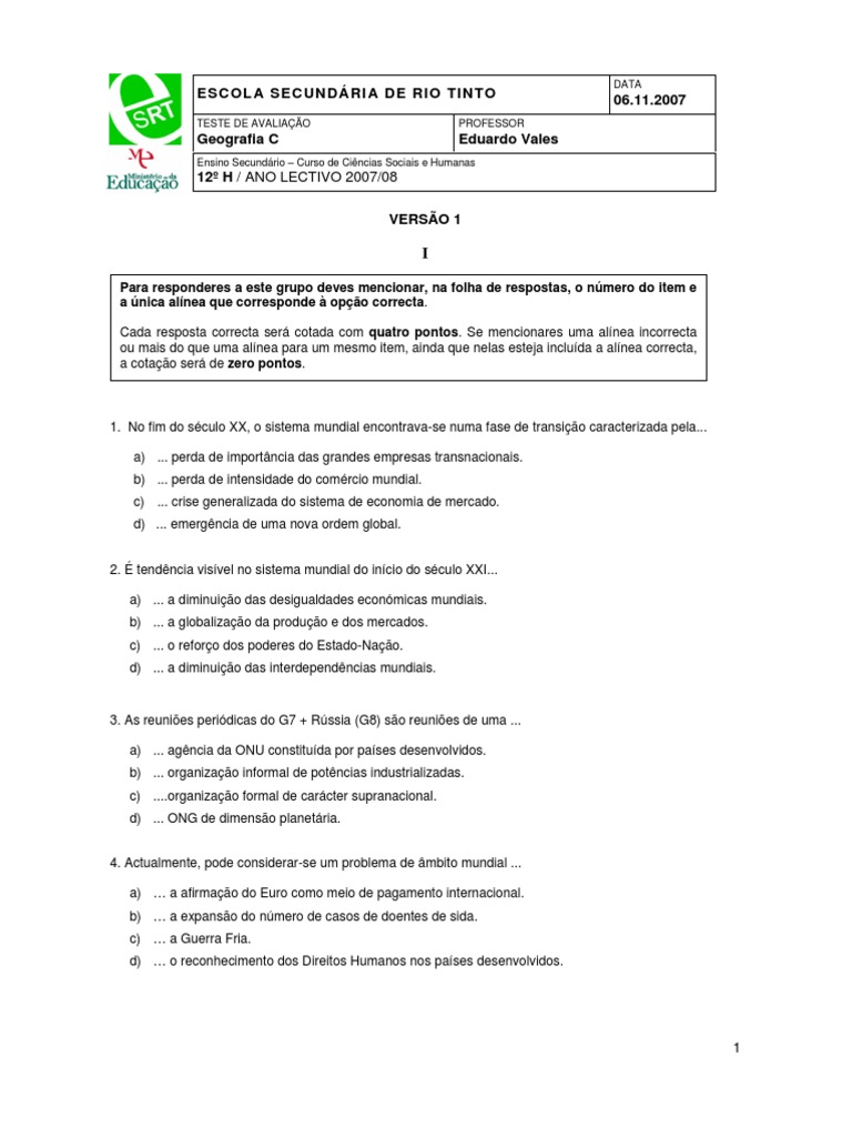 MINISTÉRIO DA EDUCAÇÃO DEPARTAMENTO DO ENSINO SECUNDÁRIO PROGRAMA DE GEOGRAFIA C 12º ano Cursos Científico-Humanísticso de Ciências Sociais e Humanas e de Ciências Sócioeconómicas Odete Sousa Martins coordenadora Maria Manuela Brazão Maria Luísa Alves Homologação 03122002. As orga nizações internacionais surgi ram no pós guerra estando vocacionadas para. Portólio de Geografia C.